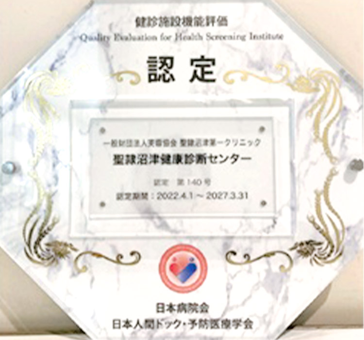 公益社団法人 日本人間ドック・予防医療学会がおこなう「人間ドック健診施設機能評価」を受審し、2007年1月15日に第1回の認定を受けております。第1回の認定後は、5年毎に継続してこの機能評価を受審しております。