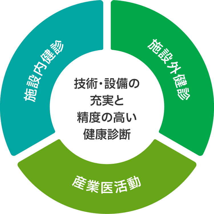 施設内における健康診断は、主として人間ドックをはじめ特定健康診査・生活習慣病健診・定期健康診断・雇入れ時健康診断・特殊健康診断等を実施しています。