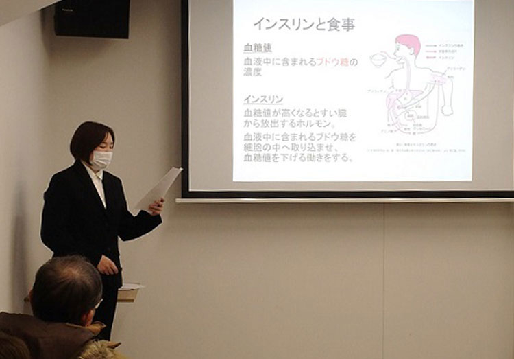 2023年12月8日(金)沼津市民を対象に「第9回 健康体力相談セミナー」が沼津市香陵アリーナ沼津市総合体育館で開催されました。 今回は、薬剤師の植田萌美より「もっと知りたい!糖尿病治療薬」をテーマに説明しました。日本の成人のうち、5人に1人が糖尿病または糖尿病予備軍といわれている昨今、糖尿病の基本的な知識や治療薬についてふれ、糖尿病の予防について学びました。 また、低血糖になった時の対処方法や注射薬の注射部位、薬剤師の視点で災害への備えなど参加者に具体的な話もすることができました。 本セミナーは、2023年3月に新体育館が開館したことに伴い、市民が気軽にスポーツや体力づく