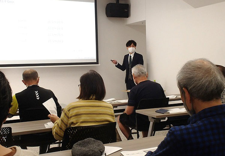2023年11月30日(木)沼津市民を対象に「第8回 健康体力相談セミナー」が沼津市香陵アリーナ(沼津市総合体育館)で開催されました。 今回は、栄養管理課 管理栄養士の福井勇人より「健康を維持するための食事」をテーマに、健康寿命延伸に向けた食事、高齢者のフレイル・サルコペニア・骨粗鬆症の予防についてお伝えしました。バランスの良い食事を摂取するために、自身に必要なタンパク質やカルシウム、ビタミンD/Kを知り健康について理解を深めました。 参加された方からは、食事回数やタンパク質の摂取方法、骨粗鬆症に効果的な食材など、複数の質問があり、生活に直結する食事に対する関心の高