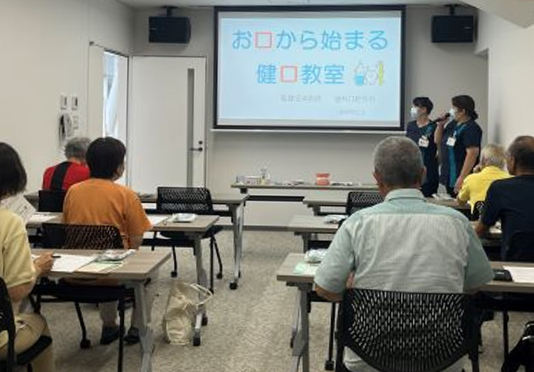 7月30日(火)に香陵アリーナ会議室にて「お口から始まる健康教室~口腔内のこと一緒に考えてみませんか?~」をテーマに、聖隷沼津病院 歯科衛生士2名が講師として招かれ、約30分のセミナーを行いました。なぜ8020(80歳で20本の健康な歯)が必要なのか、そのための自分で出来る口腔ケアや、歯医者での口腔ケアの必要性や違いなどを受講された方は熱心に聞いていました。また、実際歯のモデルを使用した歯磨き方法や、歯磨き粉の選び方、唾液がでるマッサージ方法など参加型の内容となりました。質疑応答コーナーでは約30分にわたり、受講された方から熱心な質問があがり、普段聞けないような話を聞いて参考になった