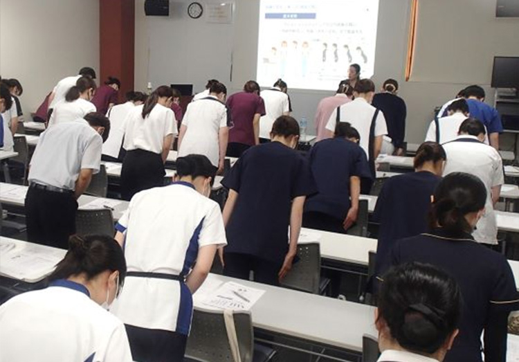 7月29日(火)(株)舎鐘の長谷川玲子氏を講師に招き、接遇マナー研修を行いました。この研修は、毎年幅広い職員に対し「患者サービスの向上」を目的に、行っております。 今年は、入職1~2年目の新人職員を中心に、身だしなみ、挨拶、言葉遣い等「接遇の基本マナー」について全44名(看護部27名 診療技術部10名 事務部3名 健診センター4名)の職員が参加しました。 参加者からは、 接遇に対しての意識を強く持てるようになった。 この研修を通して初心を忘れずに頑張っていきたい。 などの意見が寄せられました。 今後も、患者さんや利用者の方々の気