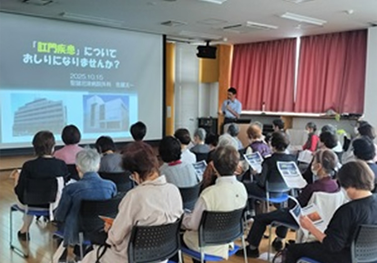 10月15日(水)、第二地区センターにて「第3回 知ってなるほど!公開講座」を開催しました。 今回のテーマは『ハズかしい?イタい?肛門疾患について、おしりになりませんか?』。 講師は当院 外科・大腸肛門病専門医の佐藤太一医師が務めました。 講座では、痔核(いぼ痔)・裂肛(きれ痔)・皮ふ痔などの肛門疾患の種類や症状、原因、治療方法について解説しました。また、痔の症状に似た別の病気が隠れている場合もあるため、自己判断せず、早めに専門医へ相談することの大切さが伝えられました。 さらに、再発予防につながる生活習慣のポイントや、正しい排便習慣についても紹介されました。 今後も当院では、地域の皆