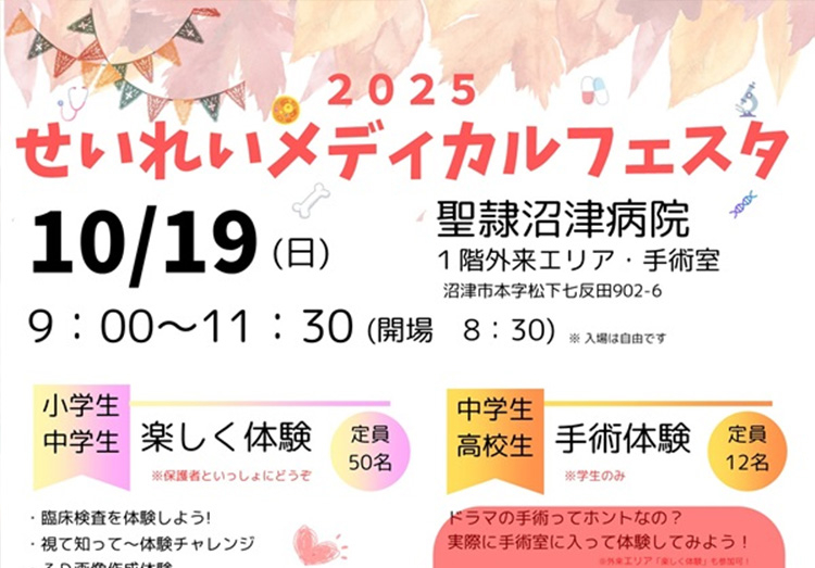 未来を担う小中高生の皆さんに、医療の仕事に親しんでもらい、地域の医療を支える人材を育てるきっかけになればとの思いから、「せいれいメディカルフェスタ」 を開催します。 当院は、地域の皆さまに開かれた病院として、医療現場を実際に体験できる機会を大切にしています。今回のイベントは、薬剤師、検査技師などの楽しい体験を通して、医療をもっと身近に感じていただける内容をご用意しました。 開催概要 日時 10月19日(日)9:00〜11:30(開場8:30) 場所 聖隷沼津病院 1階 外来エリア 対象