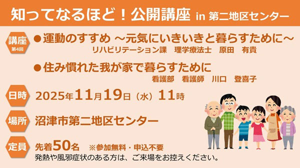 | 講座内容 | 第1部 運動のすすめ ~元気に生き生きと暮らすために~(講師:理学療法士 原田) 第2部 住み慣れた我が家で暮らすために(講師:看護部次長 川口) |