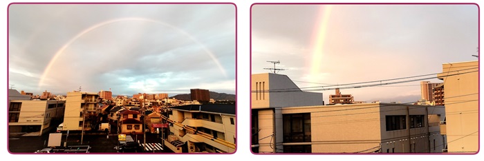 本日夕方、窓の外に色鮮やかな虹が姿を見せ、心が和む瞬間となりました。