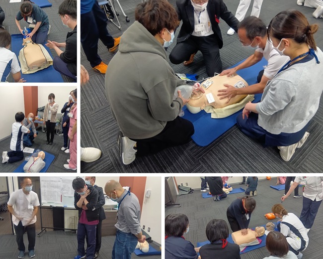 当日は、講義およびDVD視聴を通して、要救助者の発見から胸骨圧迫、人工呼吸、AED使用までの一連の流れを学びました。続く実技研修では、院内インストラクターの指導のもと、成人CPRマネキンやAEDトレーナーを使用し、グループに分かれて胸骨圧迫や人工呼吸、AED操作を実践しました。あわせて、シナリオに沿ったスキルテストと筆記テストを行い、理解度の確認を行いました。