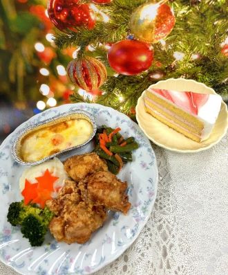 当院では12月25日にクリスマス献立を提供しました。入院しているとクリスマスの雰囲気も味わいにくいと思います。食事で少しでもクリスマス気分を感じていただきたく、目で見ても楽しんでいただけるように、いつものメニューよりもカラフルに仕上げました。この食事を通して一時でも入院患者様の気分が晴れたら嬉しく思います。
