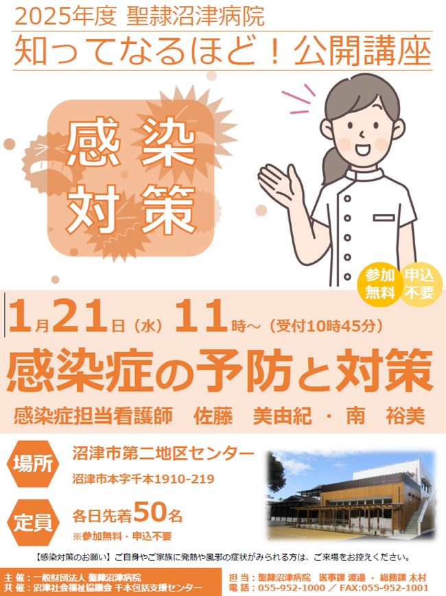 当日は、感染症担当看護師の佐藤美由紀、南裕美が講師を務め、冬季に流行しやすい感染症を中心に、正しい知識や具体的な予防方法についてわかりやすく解説します。ぜひお気軽にご参加ください。