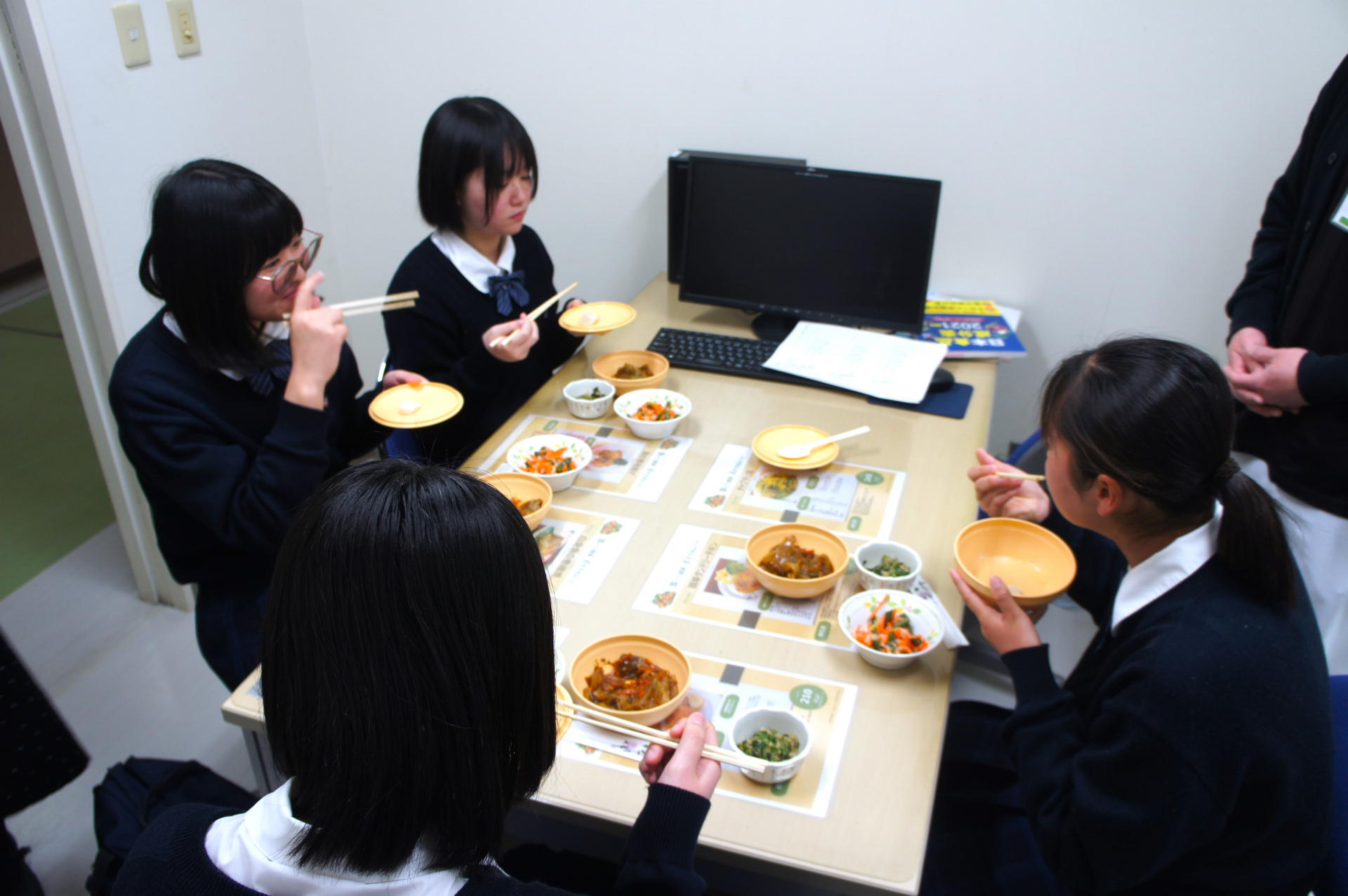 臨床工学技士の体験では手術室に入り医療機器の説明を受け、管理栄養士の体験では病院食の試食などを行いました。