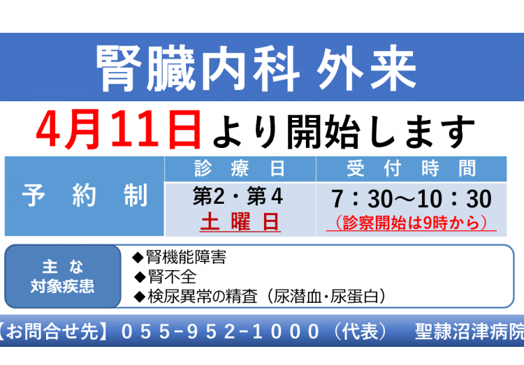 腎臓内科外来開始のお知らせ(4月11日より)