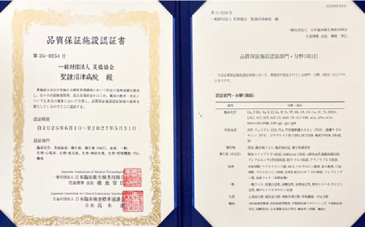 同認証は臨床検査の品質と安全性を、組織的・継続的に確保している施設であることを、日本臨床衛生検査技師会が第三者的に認証する制度で、臨床検査の「正確性」「信頼性」「再現性」を、人・設備・体制・運用の面から総合的に評価します。当院では院内で検査を実施している臨床化学、血液、一般、免疫、微生物、輸血、生理の6部門すべてに関して認証を取得しました。