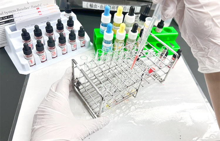 輸血検査では、貧血や出血、手術時などで輸血が必要になった場合、患者さんに必要な血液成分を補充する輸血に関わる検査全般を行っています。