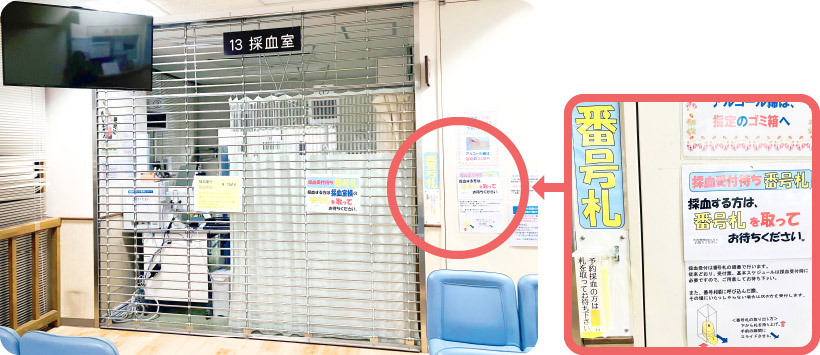 - 朝は大変混雑します。採血や各種検査(検体提出等)がある方は、混雑防止のため「黄色の番号札」を取って(容器の下部から札を引き出す)お待ちください。