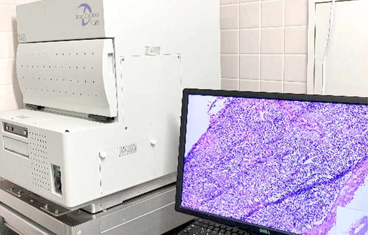 手術中に採取した組織を「がんか良性か」「リンパ節転移があるか」などを短時間で診断する検査です。手術の範囲や方法を決定するために重要な検査で、確実な切除と過剰な切除の回避、再手術の減少に貢献しています。(当院では聖隷浜松病院に依頼し、遠隔医療のひとつ「テレパソロジー」を実施しています。)