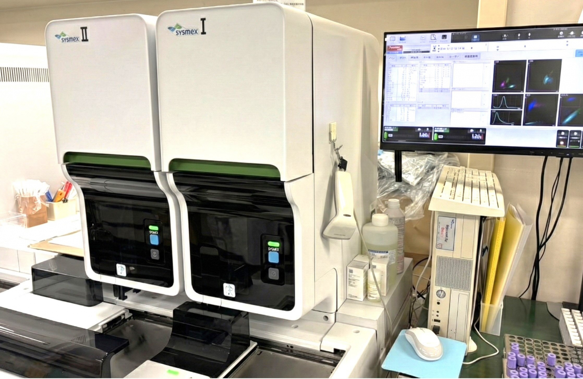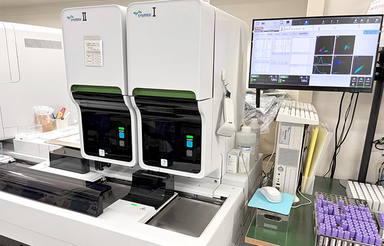 血液検査では、血液中の白血球や赤血球を計測したり、血液細胞を顕微鏡で観察したりして、貧血や感染症、血液疾患などの異常がないかを調べています。また、血液がどのように固まるかを調べる凝固検査を行っています。