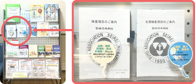 項目案内は、総合受付後方のラックにパンフレット形式でもご用意しておりますので、ご自由にお持ちください。