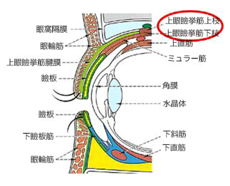 まぶたを挙げる筋肉である眼瞼挙筋の機能がどの程度のあるかによって手術方法を適正に決定します。- 吊り上げ術のような前頭筋を利用する
