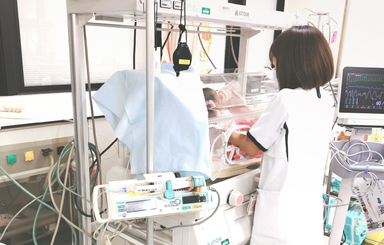 NICUは、少し早く生まれてきた赤ちゃんや、治療を必要とする赤ちゃんが入院する病棟です。産婦人科病棟と同じフロアにあり、赤ちゃんがNICUに入院中でも、お母さんが面会や授乳に来ることができます。できるだけお母さんと赤ちゃんの距離が近くなるよう、授乳やおむつ交換などの育児支援を積極的に行っています。