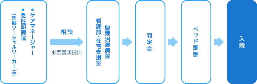 ※地域包括ケア病棟への入院の可否につきましては、申込書等の必要書類をご提出していただいた後、速やかに判定会を行い、即日ご返事させていただいております。